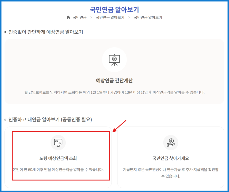 📌 최소 가입 기간(10년 이상)을 충족하지 못하면 예상 연금액이 조회되지 않습니다.