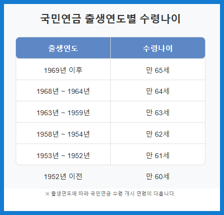 국민연금 수령 나이는 출생 연도에 따라 다릅니다.