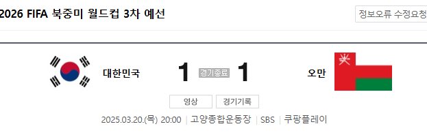 대한민국 축구 대표팀이 오만과의 홈경기에서 1대1 무승부를 기록했습니다. 경기 내용은 전반적으로 답답했으며, 선수들의 폼과 전술적인 움직임에서 아쉬움이 남았습니다.