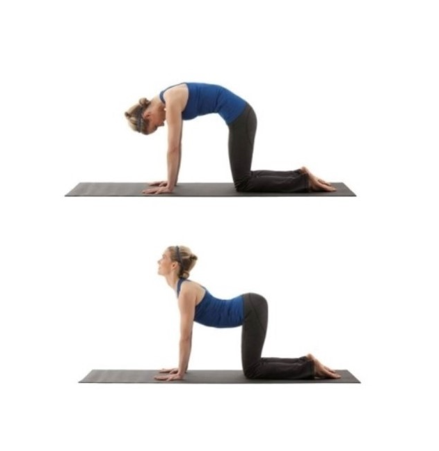 - 숨을 내쉬면서 등을 둥글게 말고 턱을 가슴 쪽으로 당깁니다 (고양이 자세).