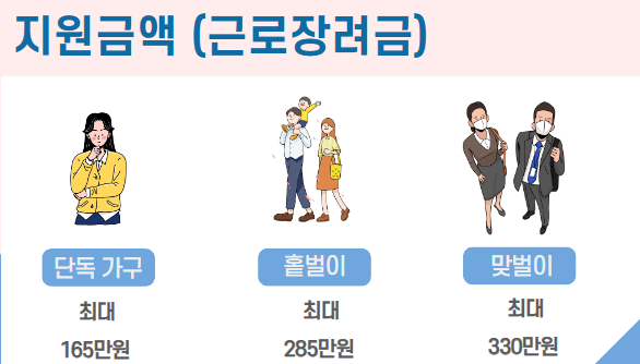 가구 유형에 따라 받을 수 있는 최대 근로장려금 금액은 다음과 같습니다.